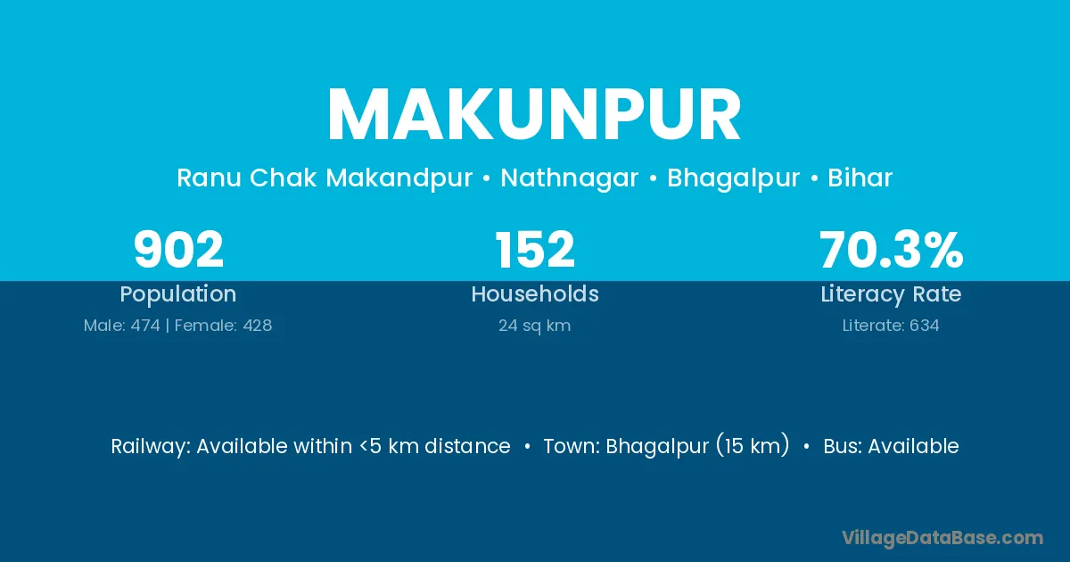 Bhagalpur (15 km) is the nearest town to Makunpur village for major economic activities and is located approximately 15 km away.