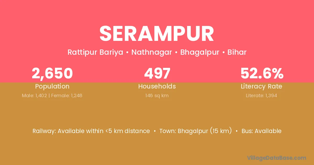 Bhagalpur (15 km) is the nearest town to Serampur village for major economic activities and is located approximately 15 km away.