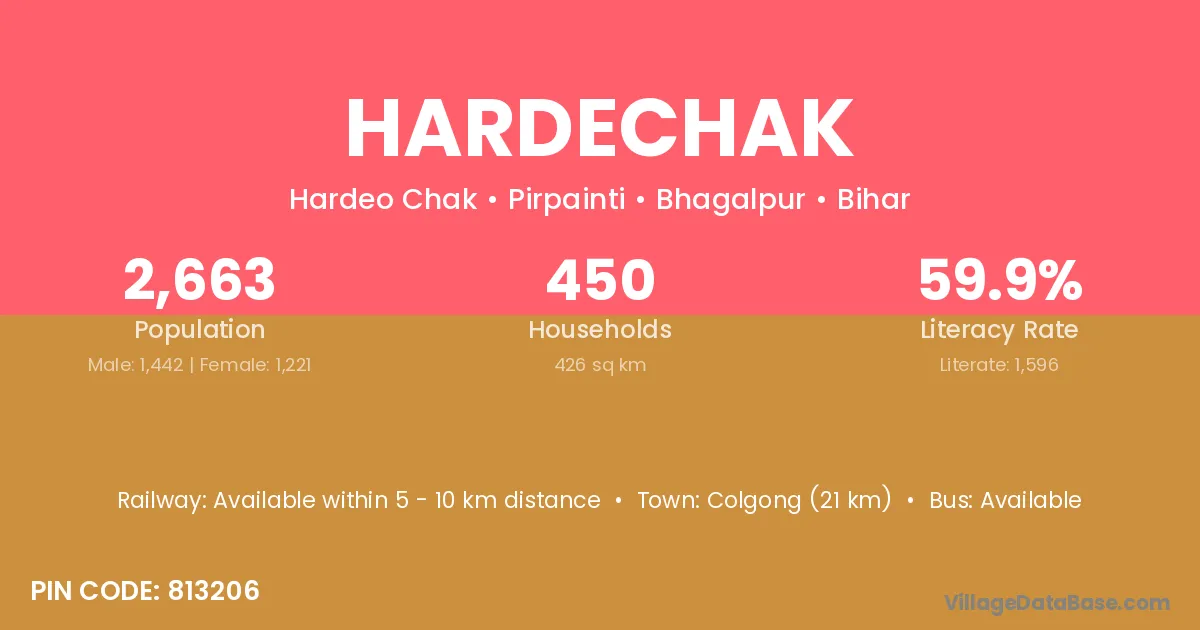 Colgong (21 km) is the nearest town to Hardechak village for major economic activities and is located approximately 21 km away.