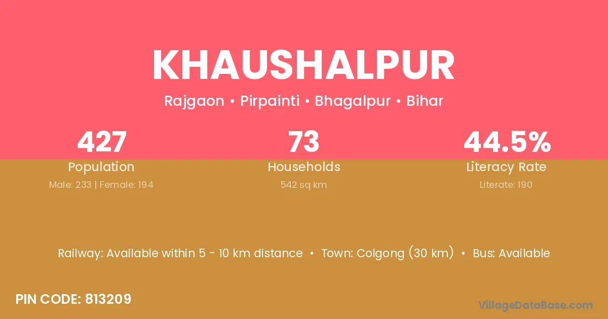 Colgong (30 km) is the nearest town to Khaushalpur village for major economic activities and is located approximately 30 km away.