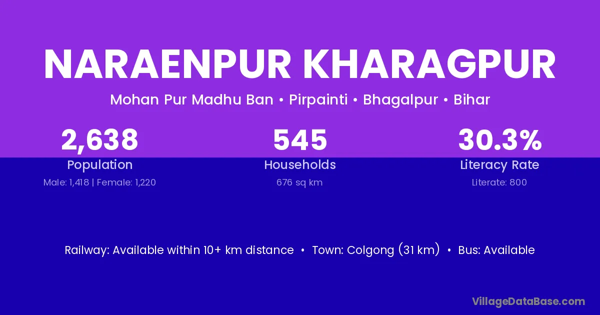 Colgong (31 km) is the nearest town to Naraenpur Kharagpur village for major economic activities and is located approximately 31 km away.