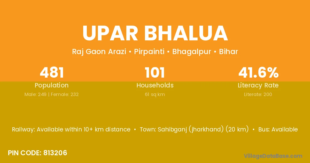 Sahibganj (jharkhand) (20 km) is the nearest town to Upar Bhalua village for major economic activities and is located approximately 20 km away.