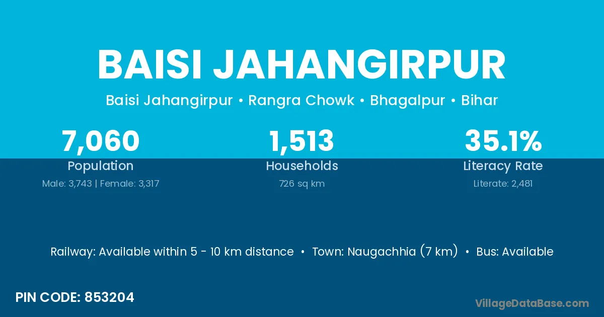 Naugachhia (7 km) is the nearest town to Baisi Jahangirpur village for major economic activities and is located approximately 7 km away.
