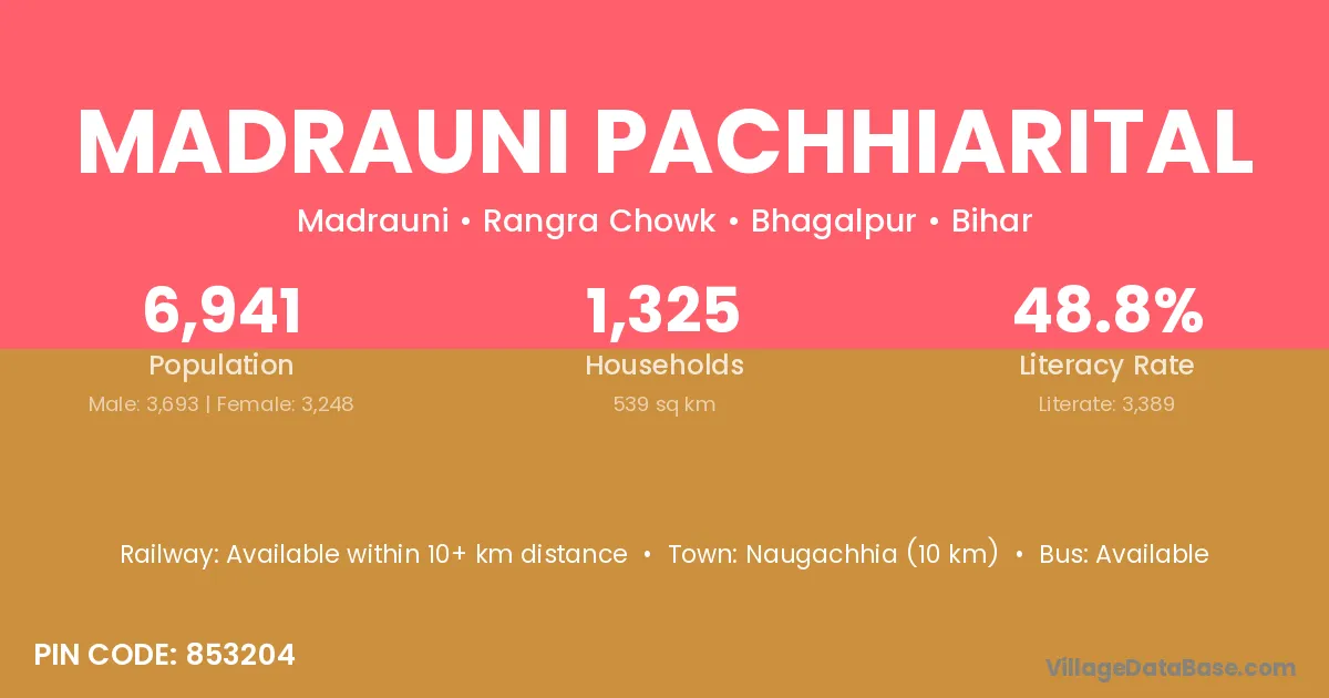 Madrauni Pachhiarital village has a total population of 6,941 people, of which 3,693 are males and 3,248 are females.