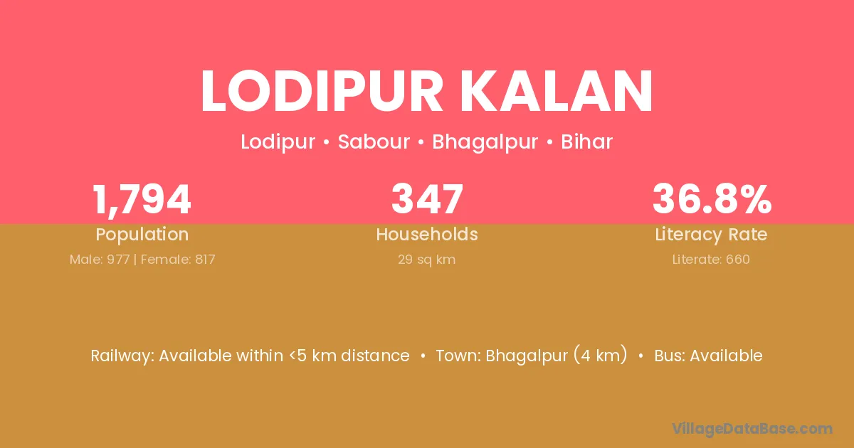 Bhagalpur (4 km) is the nearest town to Lodipur Kalan village for major economic activities and is located approximately 4 km away.