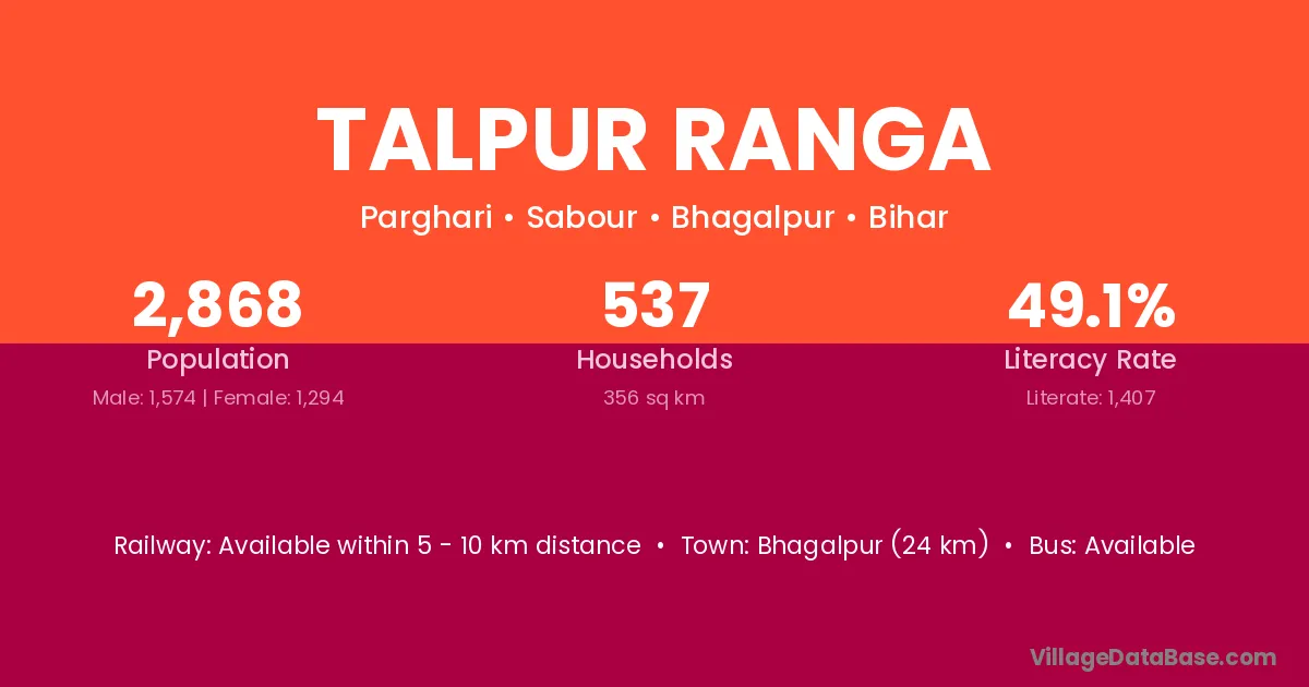 Bhagalpur (24 km) is the nearest town to Talpur Ranga village for major economic activities and is located approximately 24 km away.