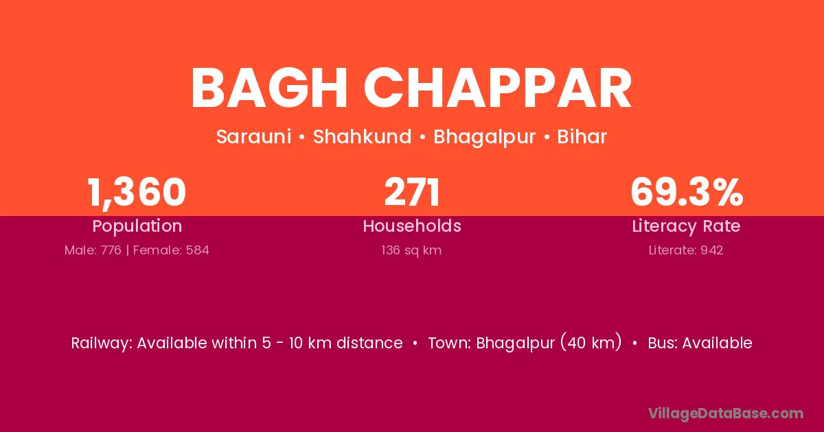 Bhagalpur (40 km) is the nearest town to Bagh Chappar village for major economic activities and is located approximately 40 km away.