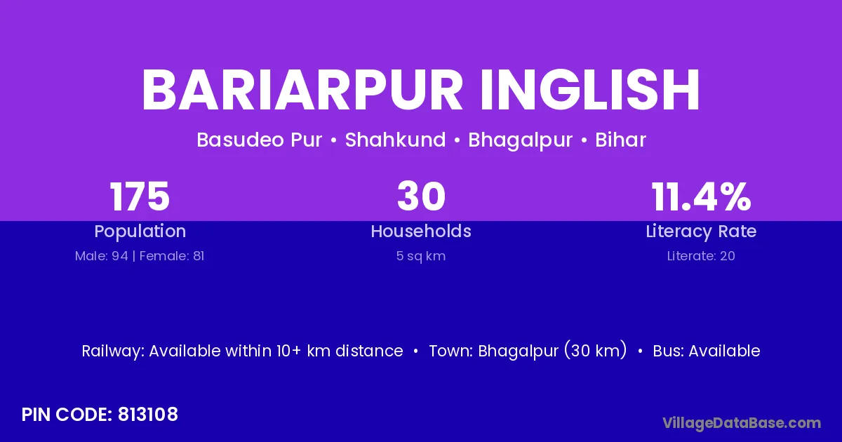 Bhagalpur (30 km) is the nearest town to Bariarpur Inglish village for major economic activities and is located approximately 30 km away.