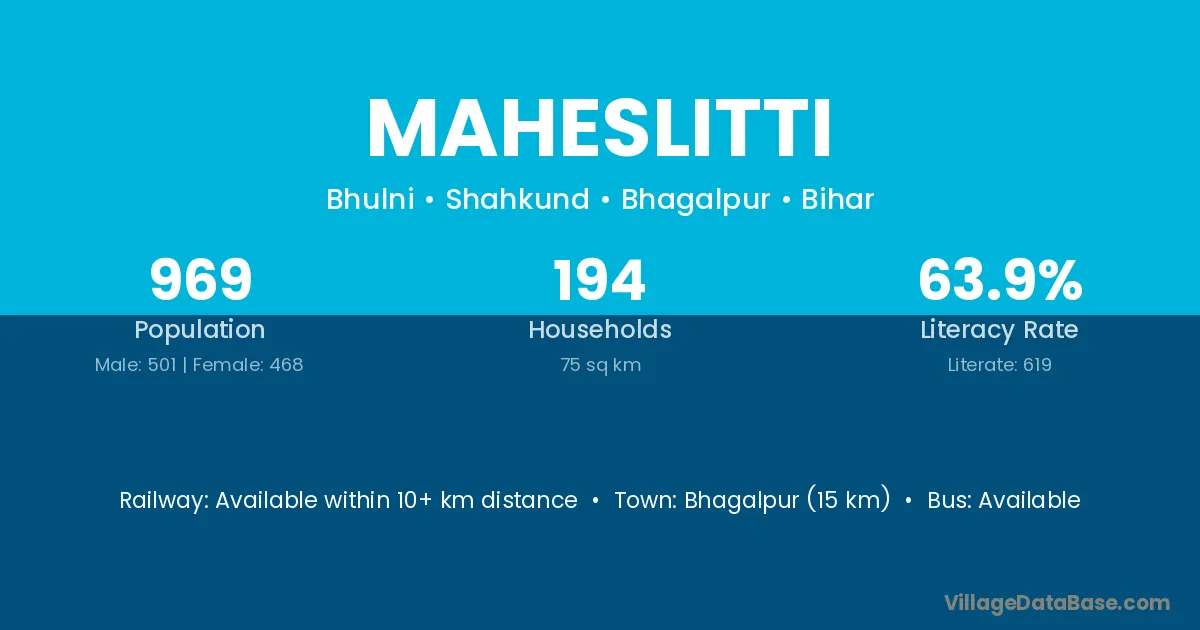 Bhagalpur (15 km) is the nearest town to Maheslitti village for major economic activities and is located approximately 15 km away.