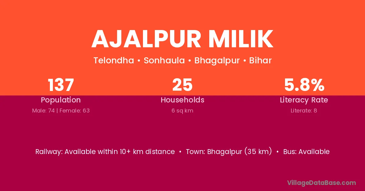 Bhagalpur (35 km) is the nearest town to Ajalpur Milik village for major economic activities and is located approximately 35 km away.