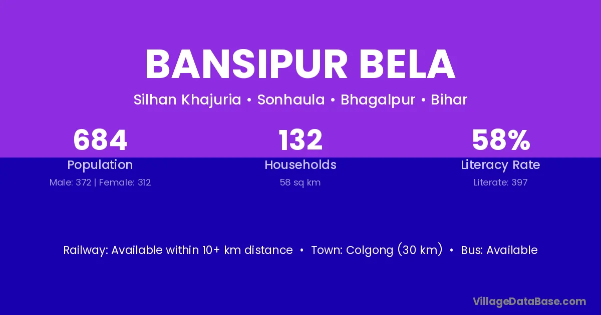 Colgong (30 km) is the nearest town to Bansipur Bela village for major economic activities and is located approximately 30 km away.
