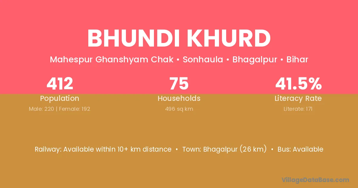 Bhagalpur (26 km) is the nearest town to Bhundi Khurd village for major economic activities and is located approximately 26 km away.