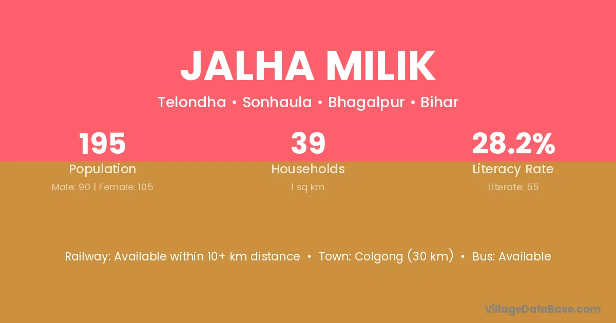 Colgong (30 km) is the nearest town to Jalha Milik village for major economic activities and is located approximately 30 km away.