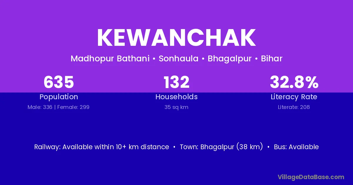 Bhagalpur (38 km) is the nearest town to Kewanchak village for major economic activities and is located approximately 38 km away.