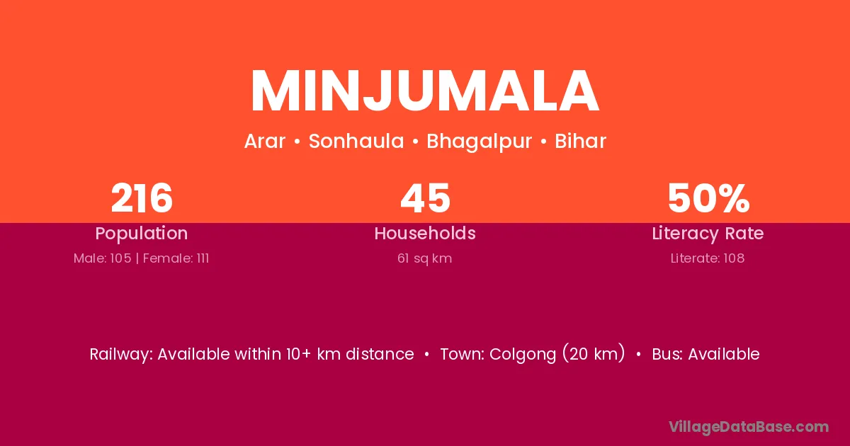 Colgong (20 km) is the nearest town to Minjumala village for major economic activities and is located approximately 20 km away.