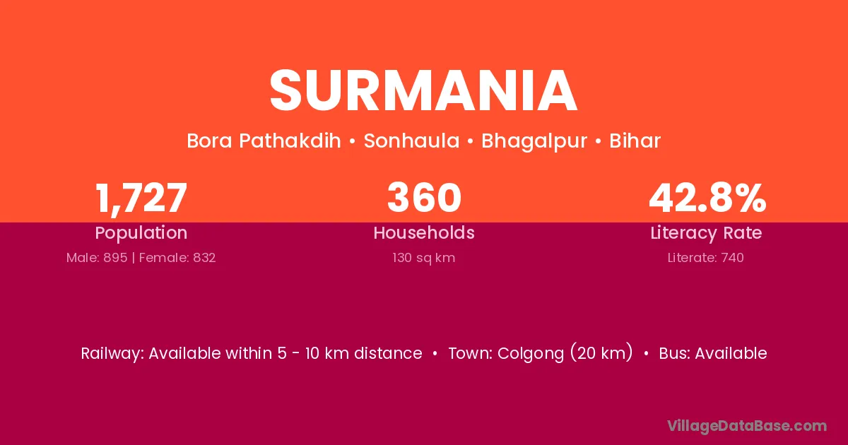 Colgong (20 km) is the nearest town to Surmania village for major economic activities and is located approximately 20 km away.
