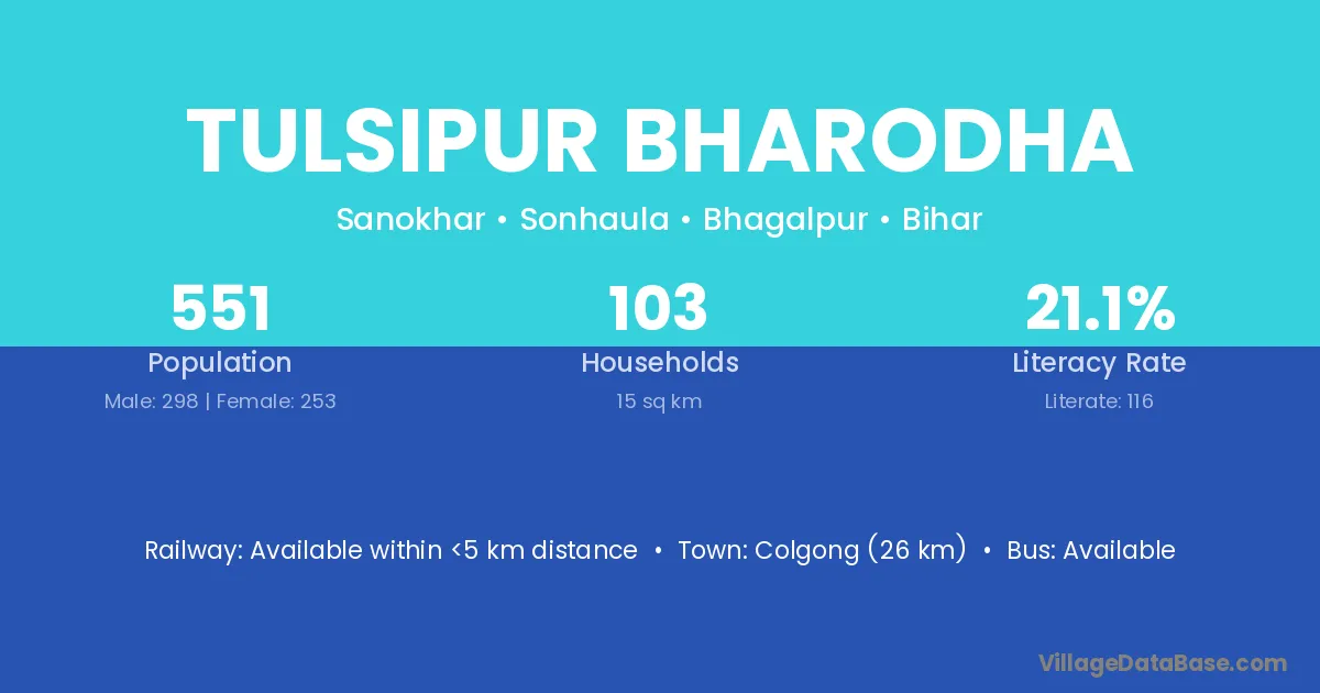 Colgong (26 km) is the nearest town to Tulsipur Bharodha village for major economic activities and is located approximately 26 km away.