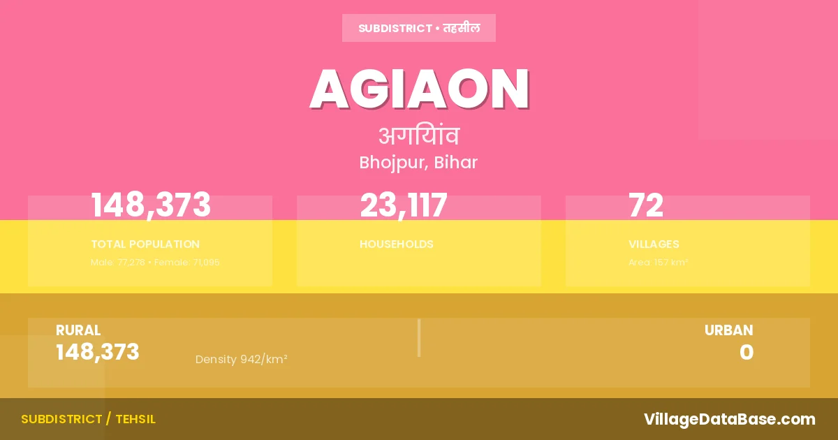 Agiaon is a town and Subdivision in the Bhojpur district of the Bihar. In India, a Subdivision is a subdivision of a district responsible for the administration and revenue collection of a specific area within the district. Subdivisions play a crucial role in the local governance structure, contributing significantly to the development and administration of their communities.