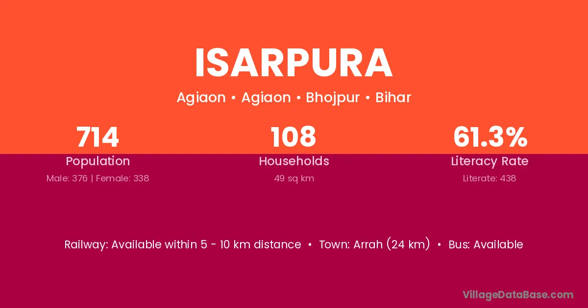 Arrah (24 km) is the nearest town to Isarpura village for major economic activities and is located approximately 24 km away.