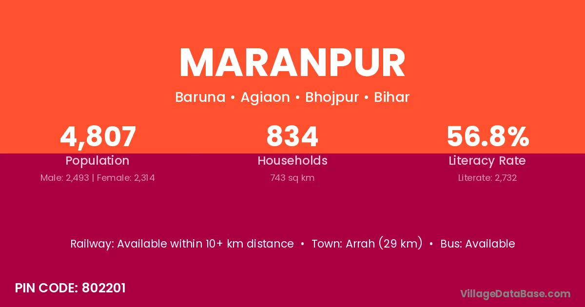 Arrah (29 km) is the nearest town to Maranpur village for major economic activities and is located approximately 29 km away.