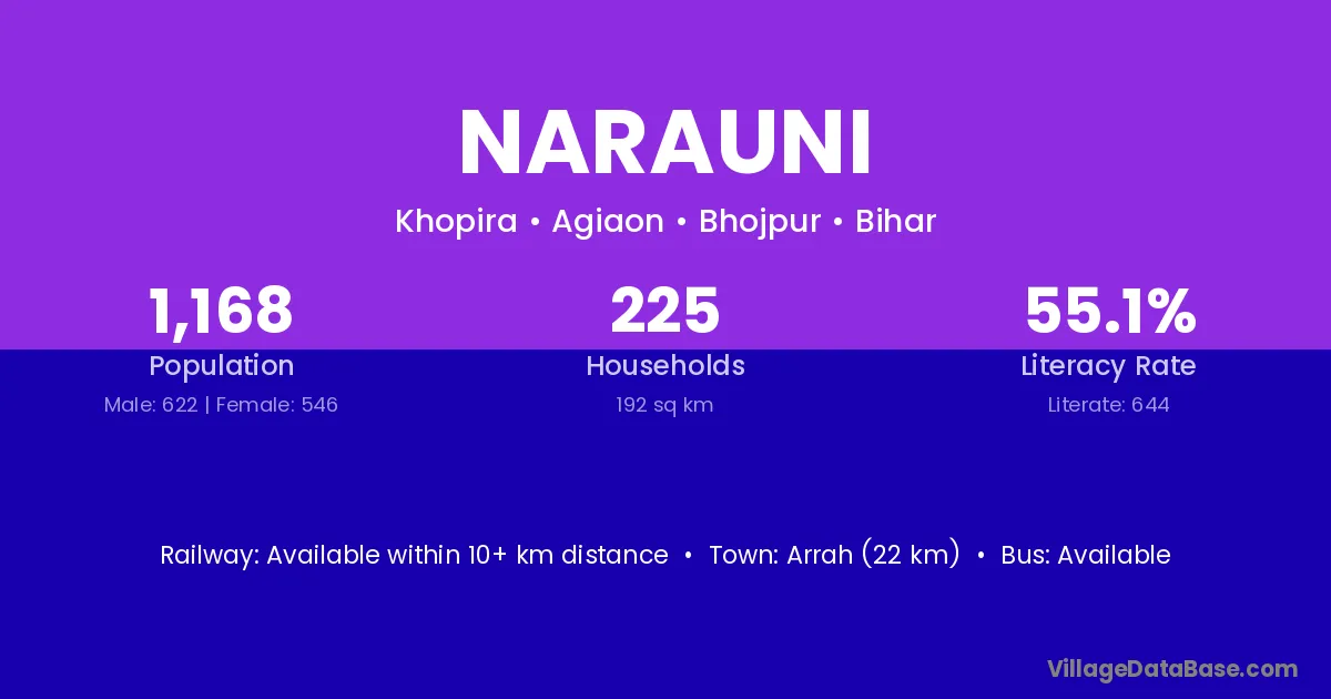 Arrah (22 km) is the nearest town to Narauni village for major economic activities and is located approximately 22 km away.