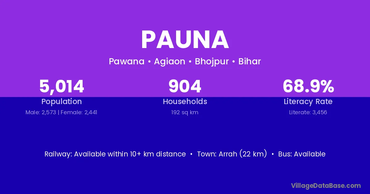 Arrah (22 km) is the nearest town to Pauna village for major economic activities and is located approximately 22 km away.