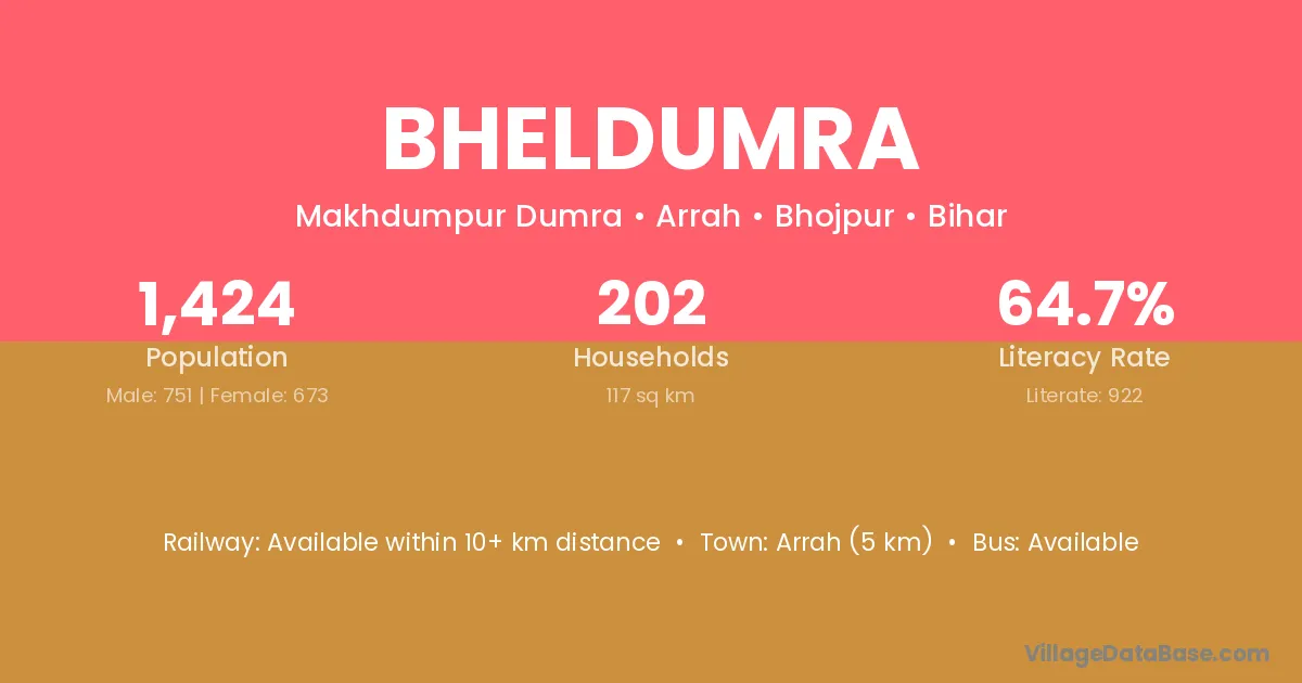 Arrah (5 km) is the nearest town to Bheldumra village for major economic activities and is located approximately 5 km away.