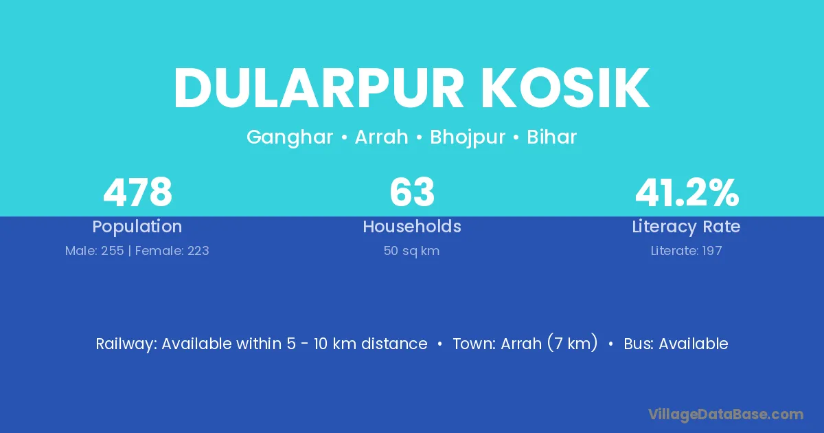 Arrah (7 km) is the nearest town to Dularpur Kosik village for major economic activities and is located approximately 7 km away.