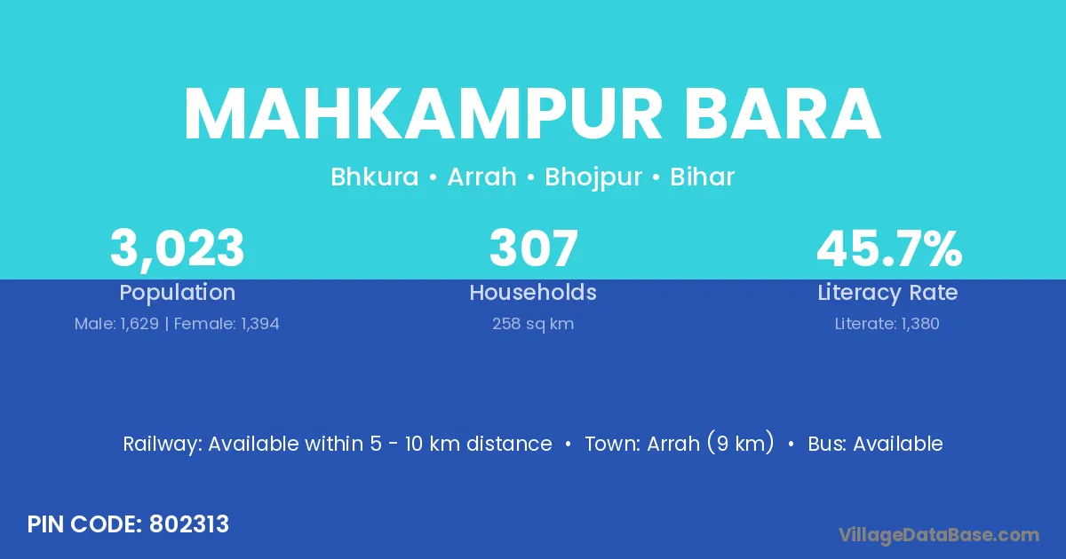 Arrah (9 km) is the nearest town to Mahkampur Bara village for major economic activities and is located approximately 9 km away.