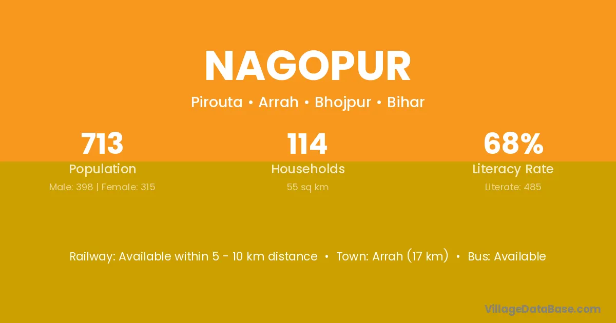 Arrah (17 km) is the nearest town to Nagopur village for major economic activities and is located approximately 17 km away.