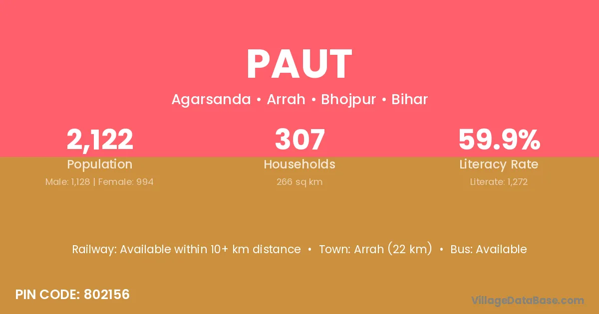 Arrah (22 km) is the nearest town to Paut village for major economic activities and is located approximately 22 km away.