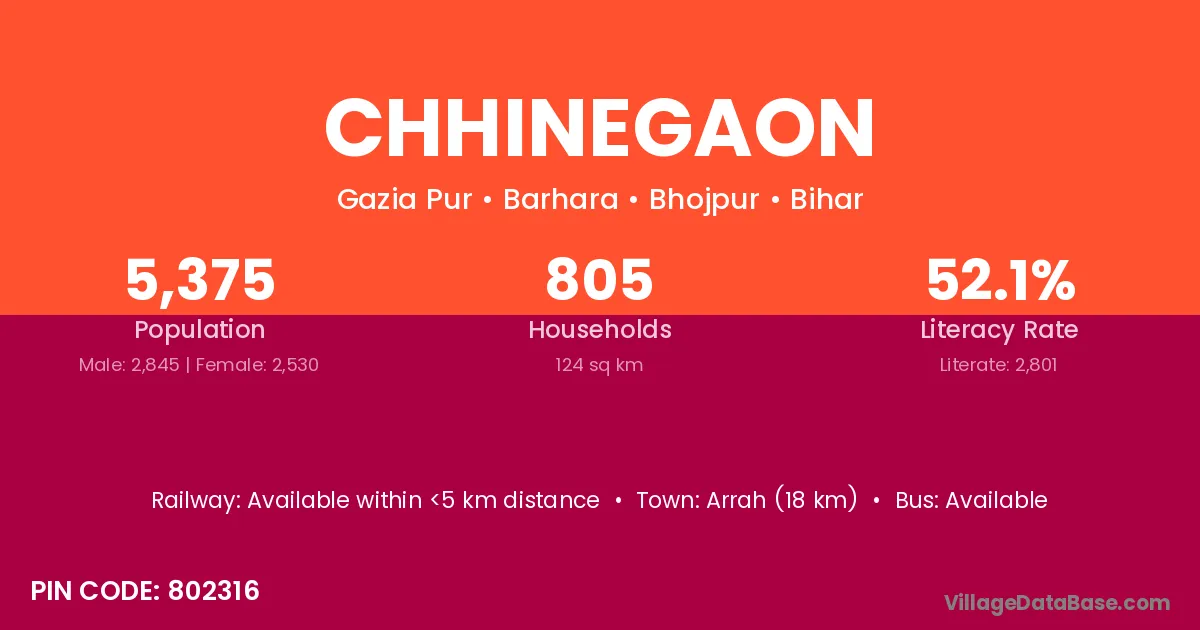 Arrah (18 km) is the nearest town to Chhinegaon village for major economic activities and is located approximately 18 km away.