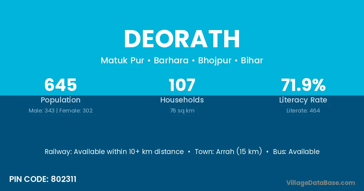 Arrah (15 km) is the nearest town to Deorath village for major economic activities and is located approximately 15 km away.