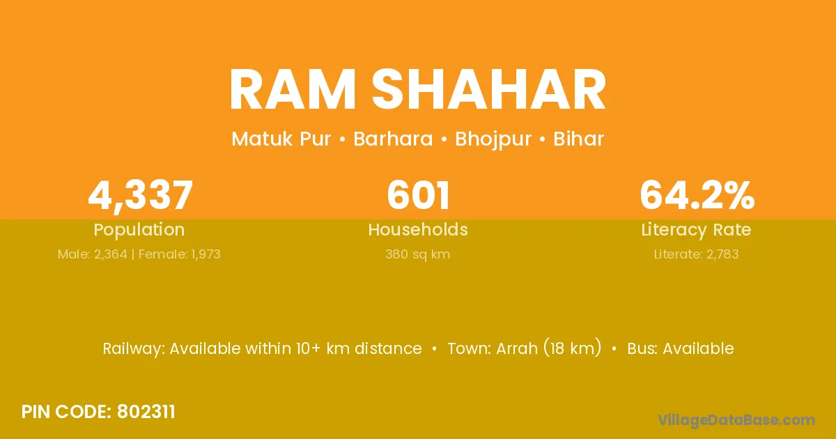 Arrah (18 km) is the nearest town to Ram Shahar village for major economic activities and is located approximately 18 km away.