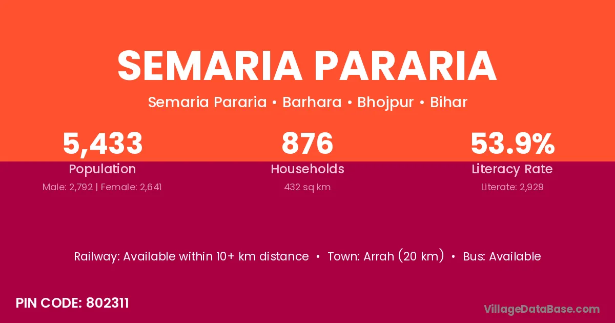Arrah (20 km) is the nearest town to Semaria Pararia village for major economic activities and is located approximately 20 km away.
