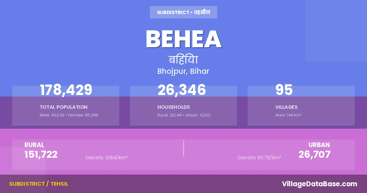 According to the 2011 census The total area of Behea Subdivision is 144 km², with a population of 178429 people. The population density is 1,239 inhabitants per square kilometre, and there are approximately 26346 houses in the sub district.