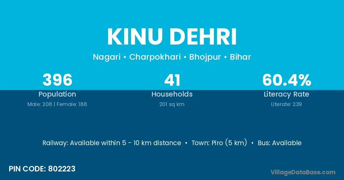 Piro (5 km) is the nearest town to Kinu Dehri village for major economic activities and is located approximately 5 km away.