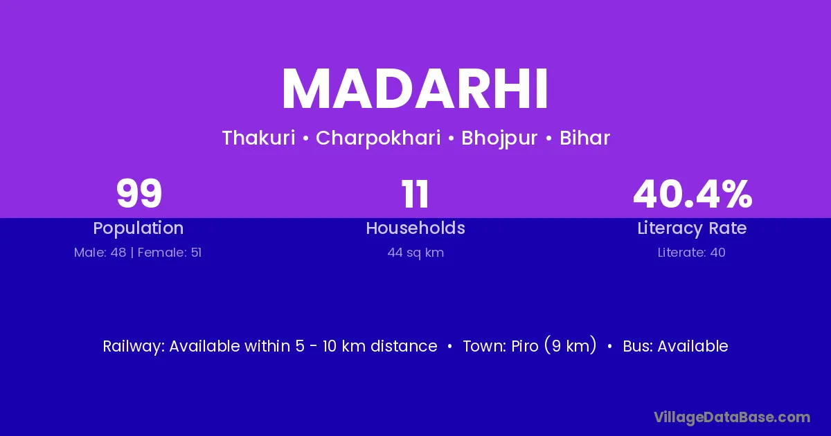 Piro (9 km) is the nearest town to Madarhi village for major economic activities and is located approximately 9 km away.