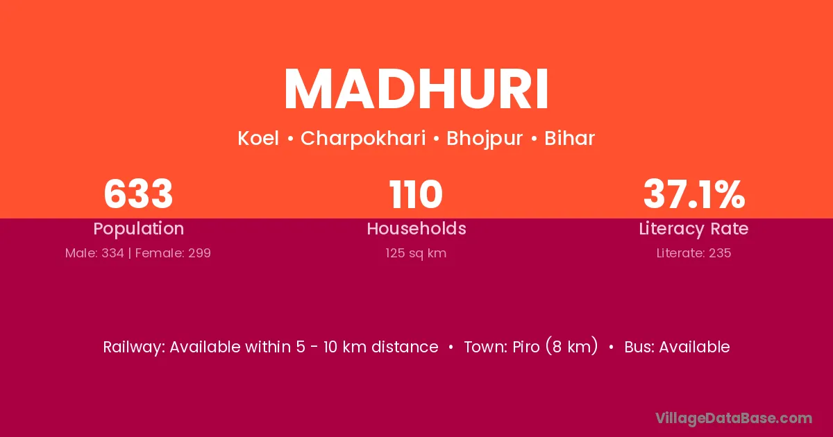 Piro (8 km) is the nearest town to Madhuri village for major economic activities and is located approximately 8 km away.