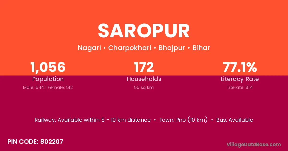 Piro (10 km) is the nearest town to Saropur village for major economic activities and is located approximately 10 km away.