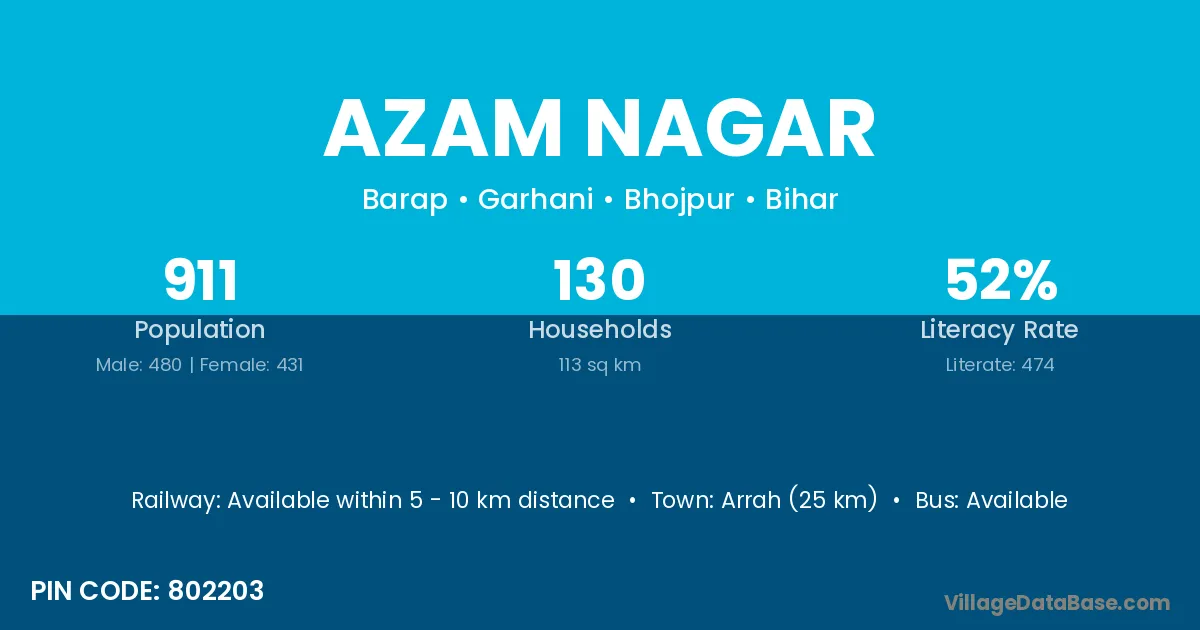Arrah (25 km) is the nearest town to Azam Nagar village for major economic activities and is located approximately 25 km away.