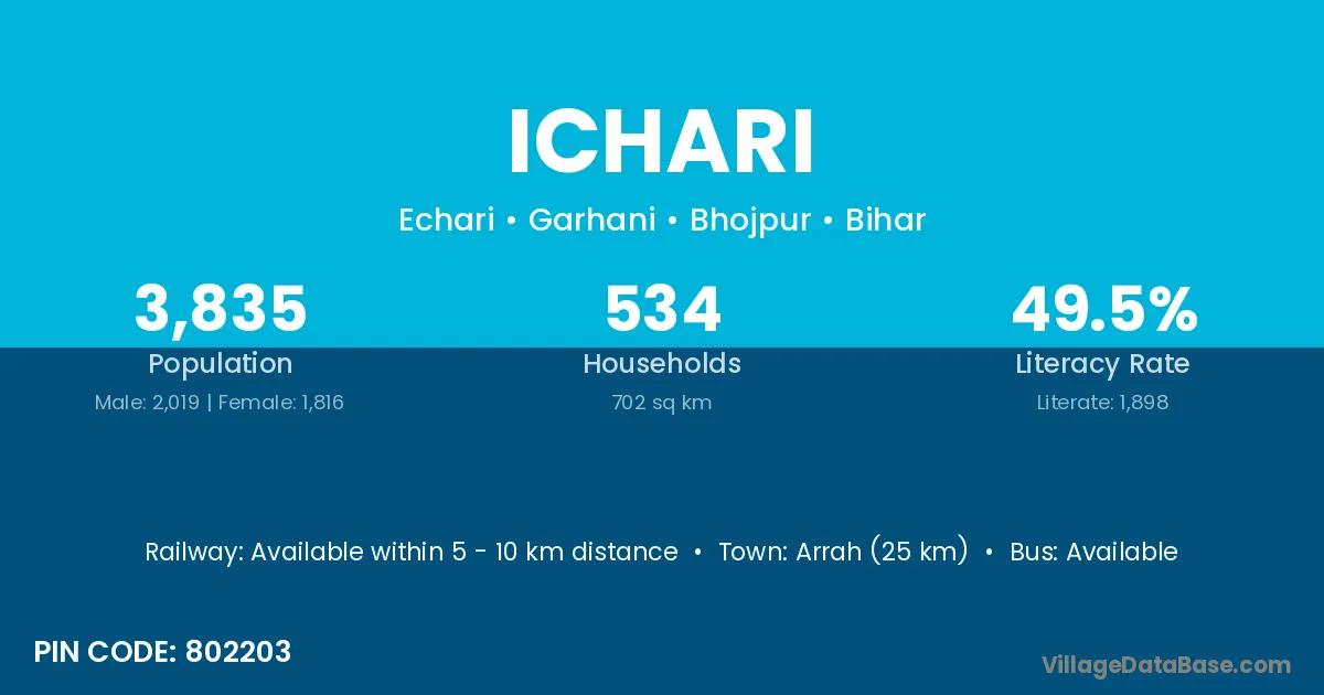 Arrah (25 km) is the nearest town to Ichari village for major economic activities and is located approximately 25 km away.