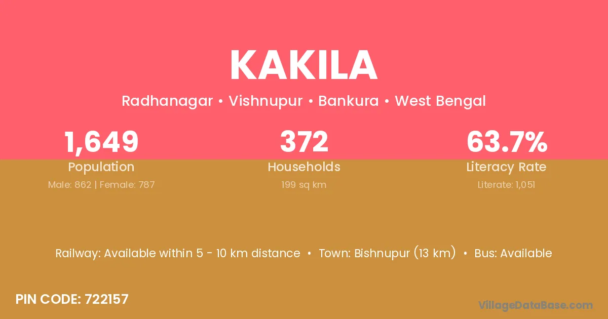 Kakila village has a total population of 3,279 people, of which 1,717 are males and 1,562 are females.