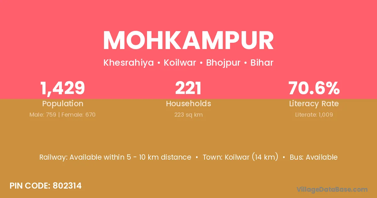 Koilwar (14 km) is the nearest town to Mohkampur village for major economic activities and is located approximately 14 km away.