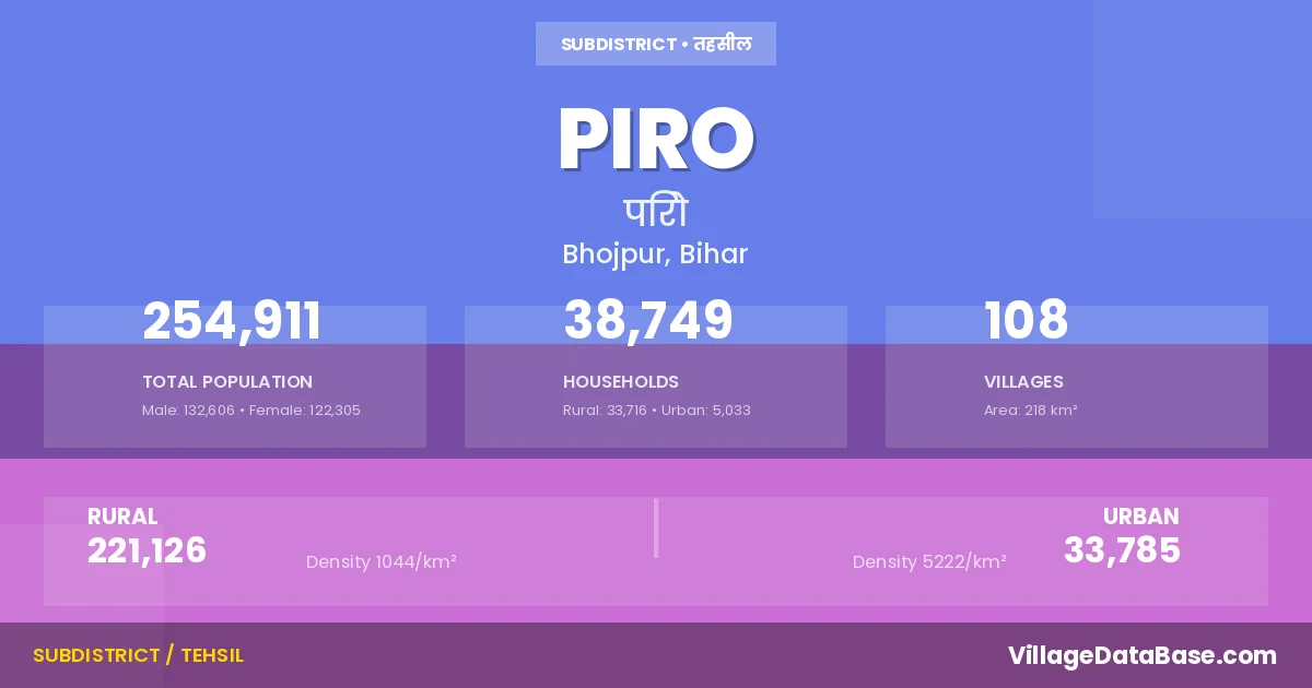 Piro is a town and Subdivision in the Bhojpur district of the Bihar. In India, a Subdivision is a subdivision of a district responsible for the administration and revenue collection of a specific area within the district. Subdivisions play a crucial role in the local governance structure, contributing significantly to the development and administration of their communities.