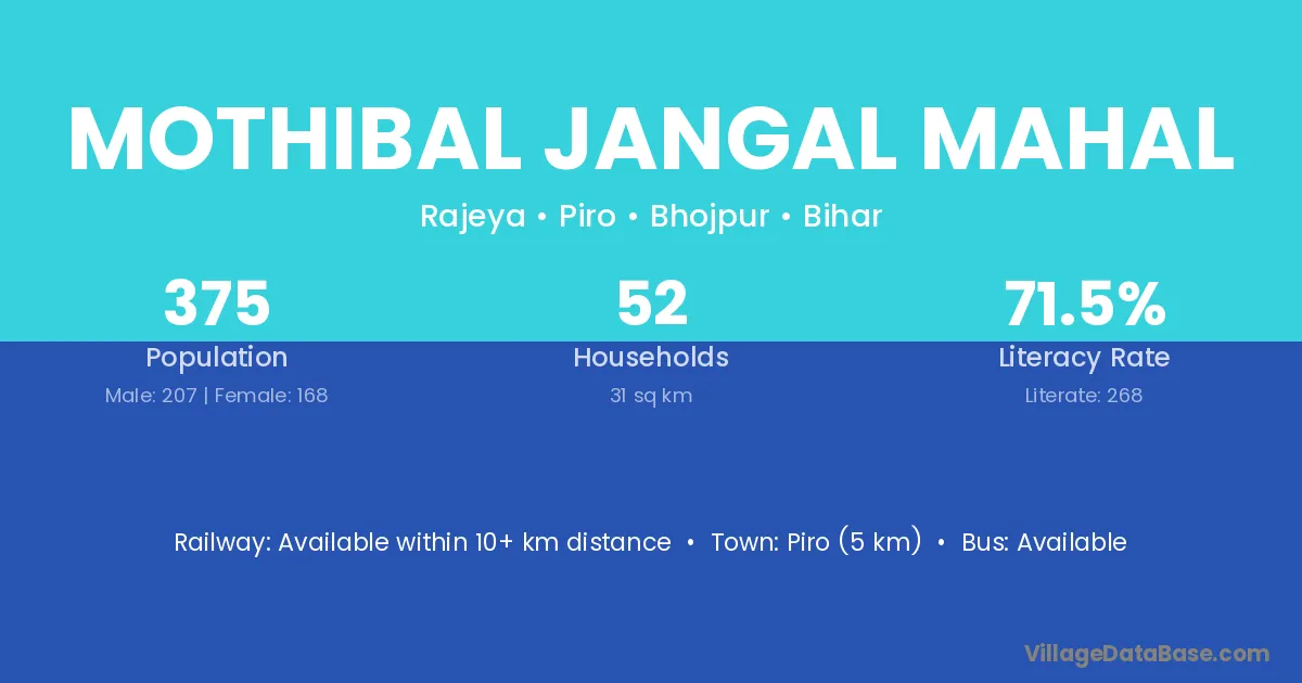 Piro (5 km) is the nearest town to Mothibal Jangal Mahal village for major economic activities and is located approximately 5 km away.