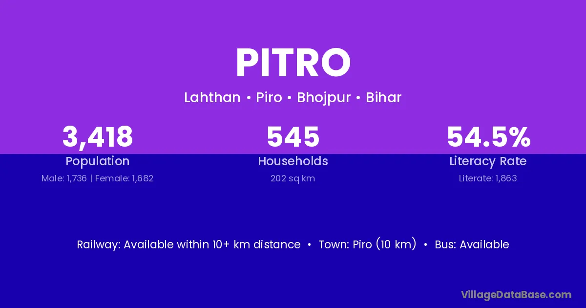 Pitro village has a total population of 3,418 people, of which 1,736 are males and 1,682 are females.