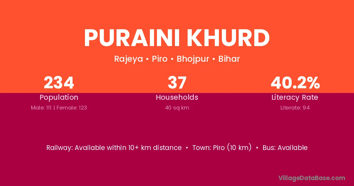 Piro (10 km) is the nearest town to Puraini Khurd village for major economic activities and is located approximately 10 km away.