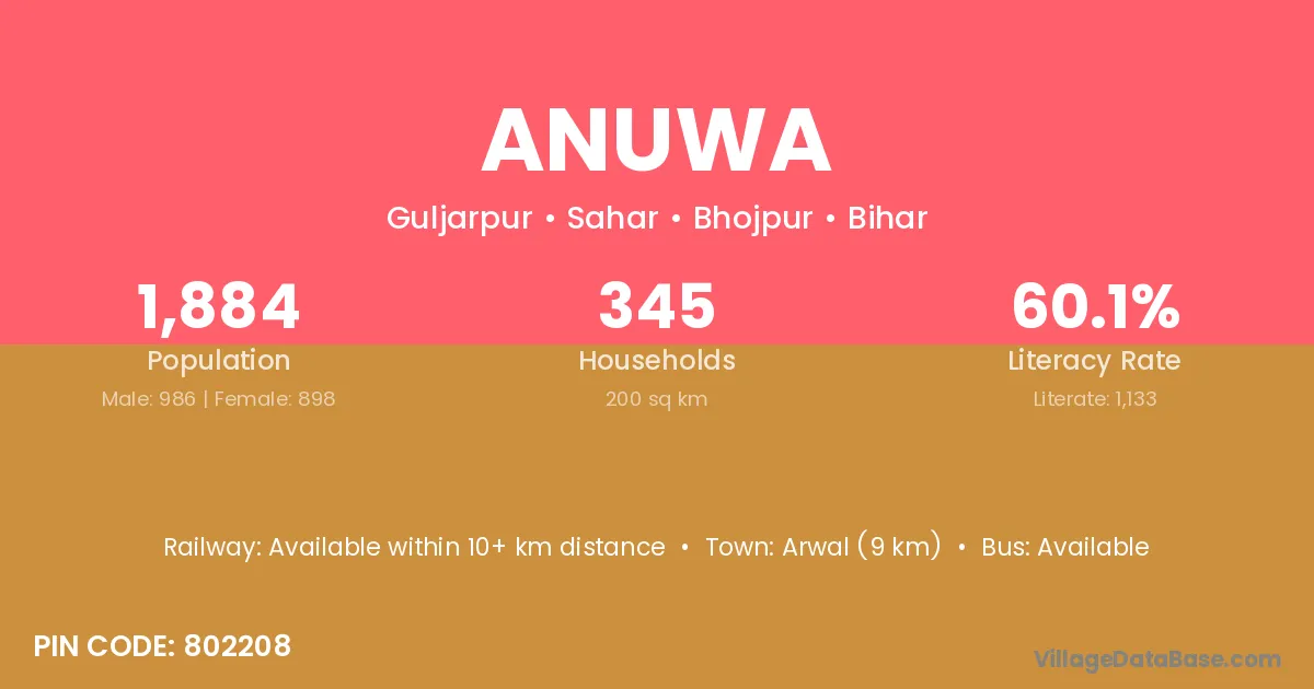 Arwal (9 km) is the nearest town to Anuwa village for major economic activities and is located approximately 9 km away.