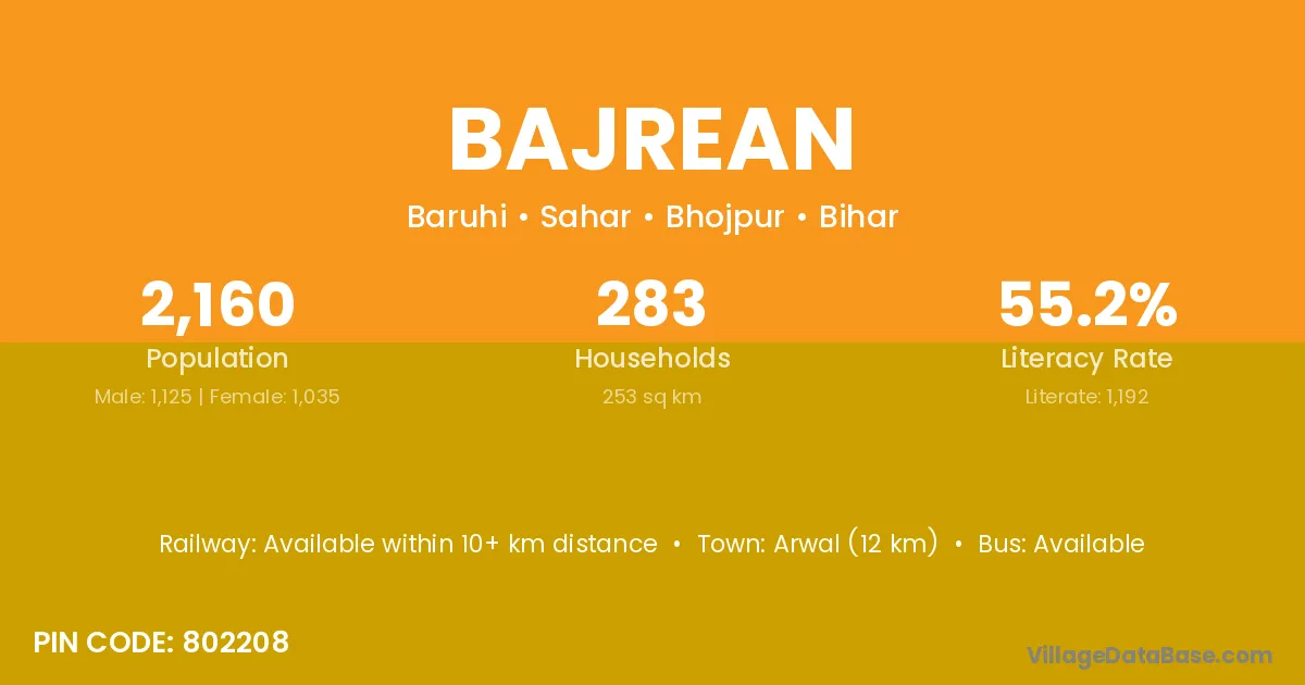 Arwal (12 km) is the nearest town to Bajrean village for major economic activities and is located approximately 12 km away.